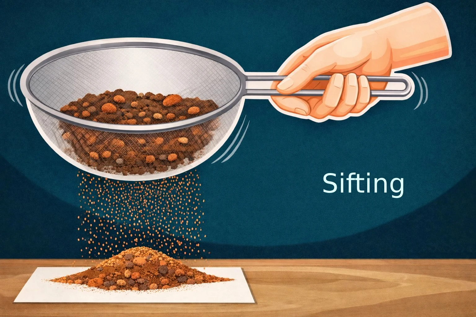 Sifting, by contrast, is a dry articulation of the same intention. The earth is passed through increasingly fine meshes, isolating particles by scale and texture. The gesture is tactile and direct: a filtering of substance that reveals gradations otherwise invisible to the eye. Each stage yields a distinct refinement of pigment — from granular residue to near-powdered luminosity.
